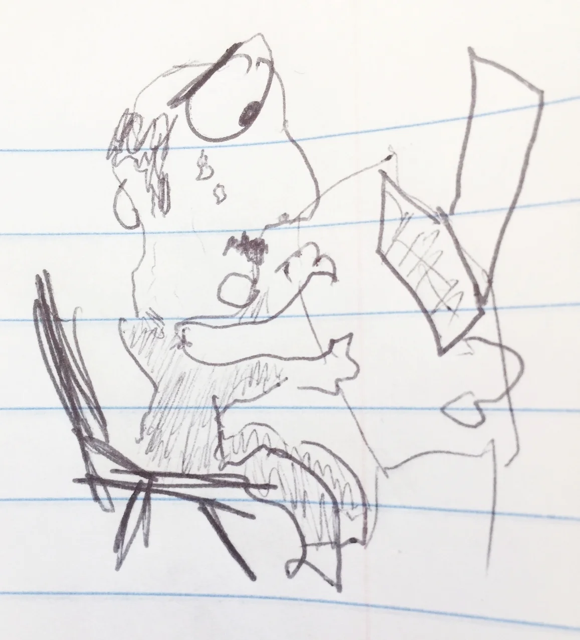 Body language: He's quick to respond and smiley. There's a slight tension in the room as if he is protecting his work. His legs and arms cross in a brief moment of defensiveness, but overall, he appears ready and prepared for the check-in.